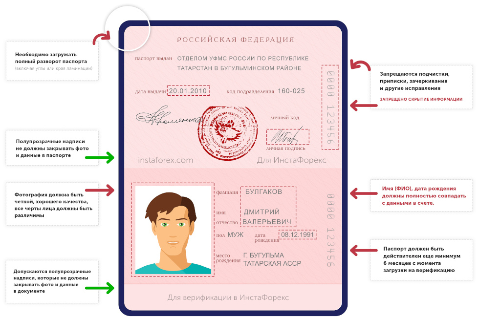 Для дополнительной защиты предоставляемых фото документов вы можете нанести на них полупрозрачную надпись: “Для верификации” или “Для InstaForex”. Обратите внимание на то, что эта надпись должна быть нанесена на свободный участок документа и не должна закрывать данные. Если вы планируете пополнение/снятие средств с помощью банковской карты/банковского перевода, фото документов необходимо загружать без каких-либо надписей. Это требование платежных агрегаторов.