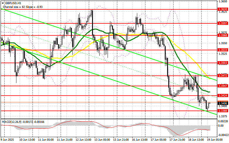 Реакция продавцов напрямую будет зависеть от решения Банка Англии и его комментариев по поводу недавнего снижения инфляции и необходимости дальнейшего снижения процентных ставок с целью стимулирования экономики. Если все это мы услышим, то фунт может просесть еще больше. Но в текущих условиях действовать лучше всего на восходящей коррекции. Первого проявления медведей ожидаю в районе 1.3424. Ложный пробой там станет подходящим условием для открытия коротких позиций с целью снижения к поддержке 1.3388. Прорыв и обратный тест снизу вверх этого диапазона нанесут удар по позициям покупателей, приведя к сносу стоп-приказов и открыв путь к 1.3363. Самой дальней целью выступит область 1.3335, где буду фиксировать прибыль. При варианте роста GBP/USD и отсутствия активности на 1.3424 продажи лучше отложить до теста более крупного сопротивления 1.3447, где проходят средние скользящие, играющие на стороне медведей. Открывать там короткие позиции собираюсь лишь на ложном пробое. При отсутствии движения вниз и там я буду продавать GBP/USD сразу на отскок от 1.3472, но лишь в расчете на коррекцию пары вниз на 30-35 пунктов внутри дня.
