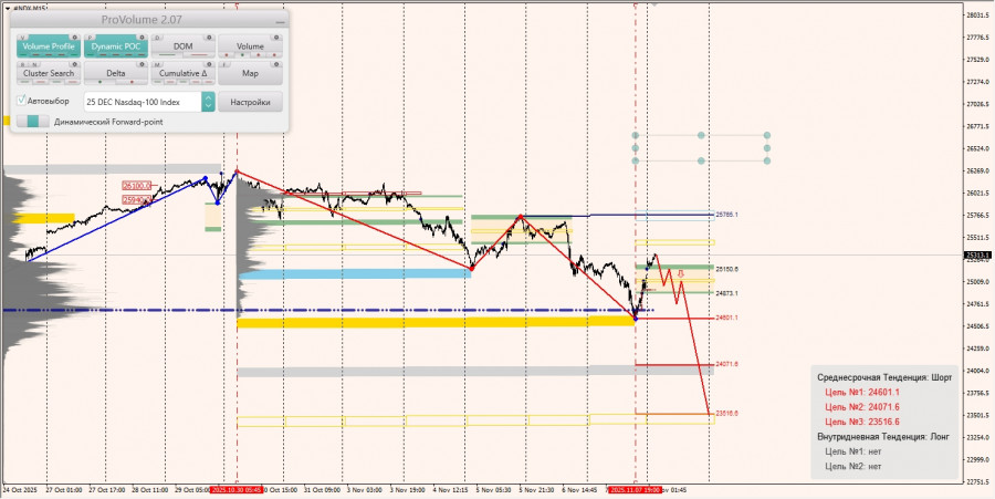 Среднесрочная маржинальная тенденция: в шорт. Максимальное скопление объемов среднесрочной тенденции расположено в диапазоне по котировкам 25940.0-26100.0. В настоящий момент по #NASDAQ совершаются инвестиционные операции ниже указанного диапазона, что говорит о силе продавцов.